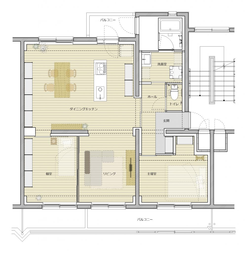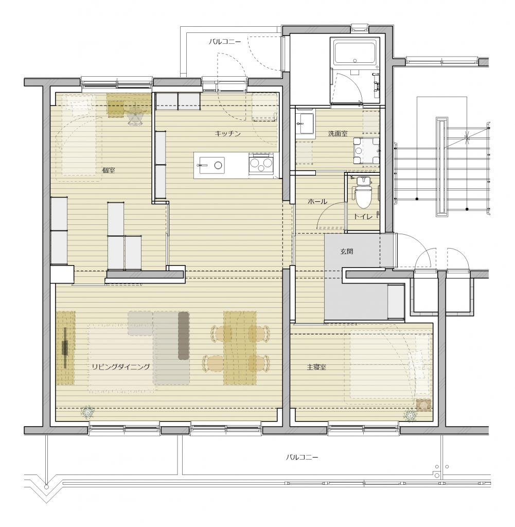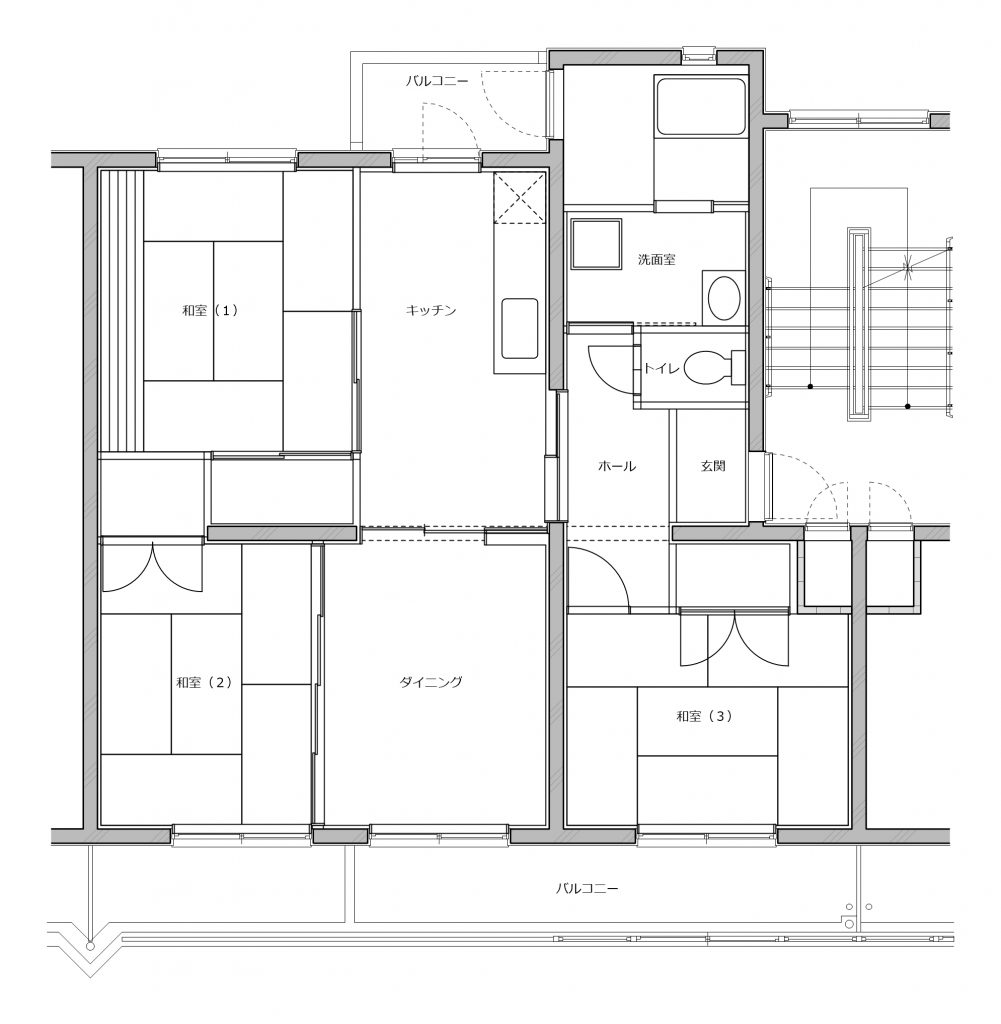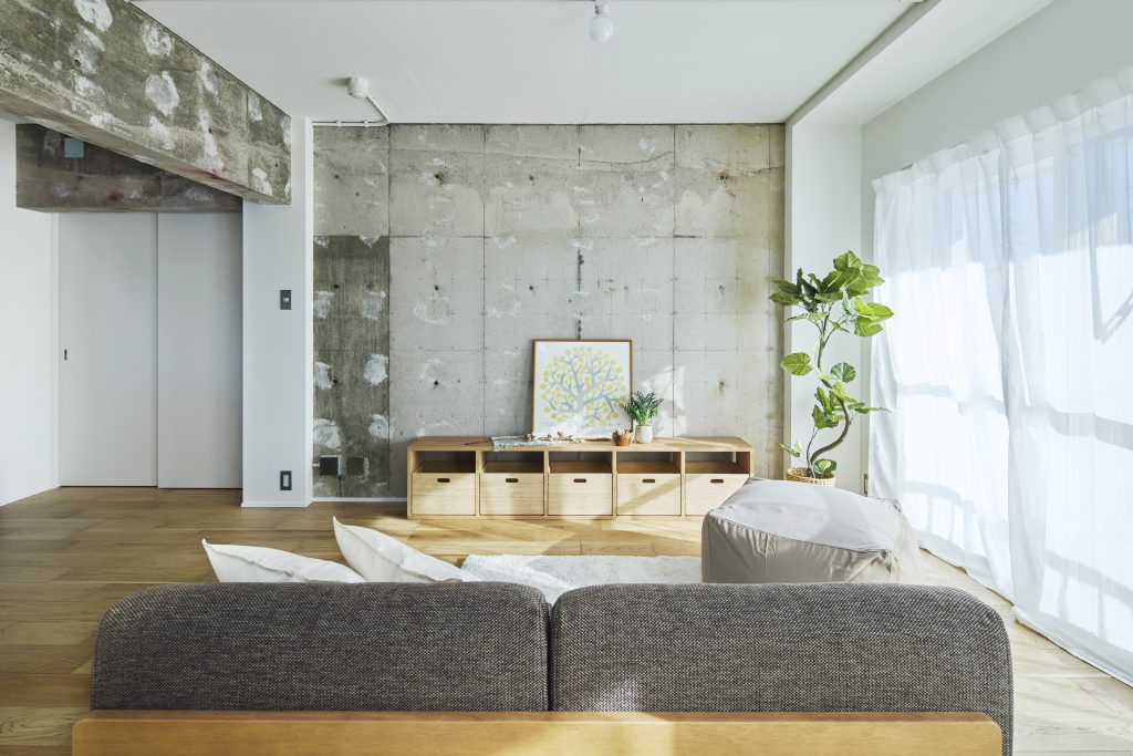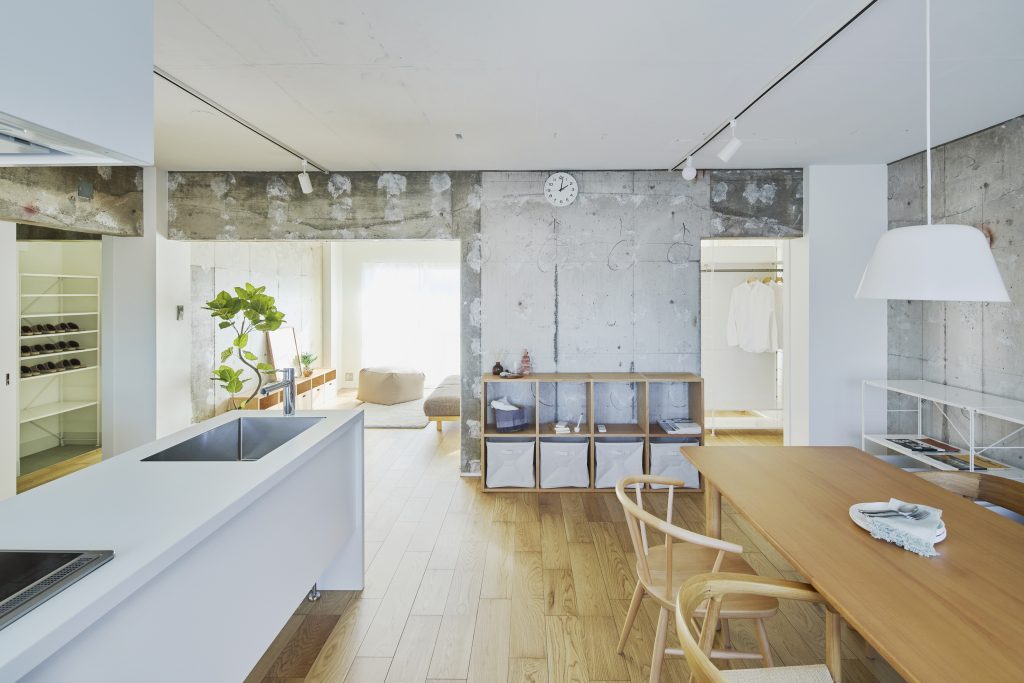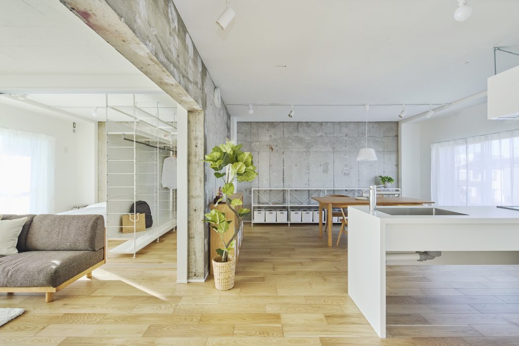 2つのプランでリノベーションを実施しました。PLAN Aでは、フルスケルト工事を行うことにより壁式構造の躯体壁の位置を確認し、躯体壁を中心に回遊できる広い LDK とアイランドキッチンのあるプランとしました。建具を開け放つことで南北に光と風を通し、2LDKから1LDKの広いLDK空間のある間取りに可変させることもできます。