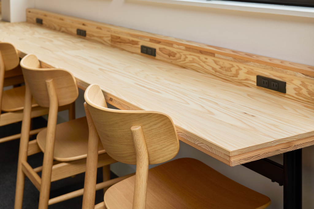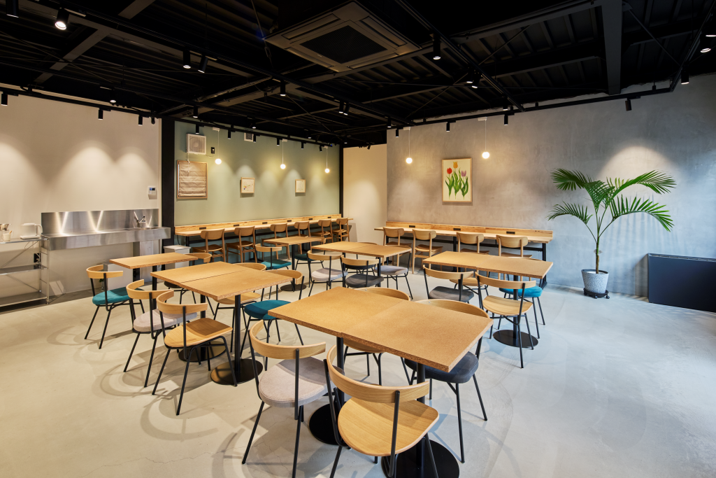 休憩スペースは壁の色やアートで柔らかい雰囲気を取り込み、一人でも複数名でも過ごせる特注カウンターや「カフェテーブル」等多様なタイプの席をランダムに配置しました。また、「コンパクトキッチン」や「MUJI HOTEL洗面台」等の水回りの機能を無駄をそぎ落としたシンプルな形で備えています。2階には「ナイロンタイルカーペット」を敷き込み、「無印良品の木の壁」にはIDÉEのアートをコーディネート。キャスター付きの「角パイプテーブル」は利用方法によって簡単にレイアウト変えることができます。