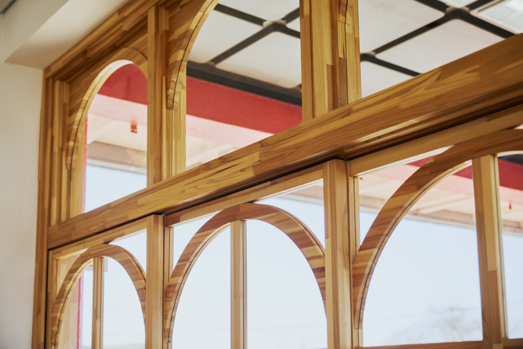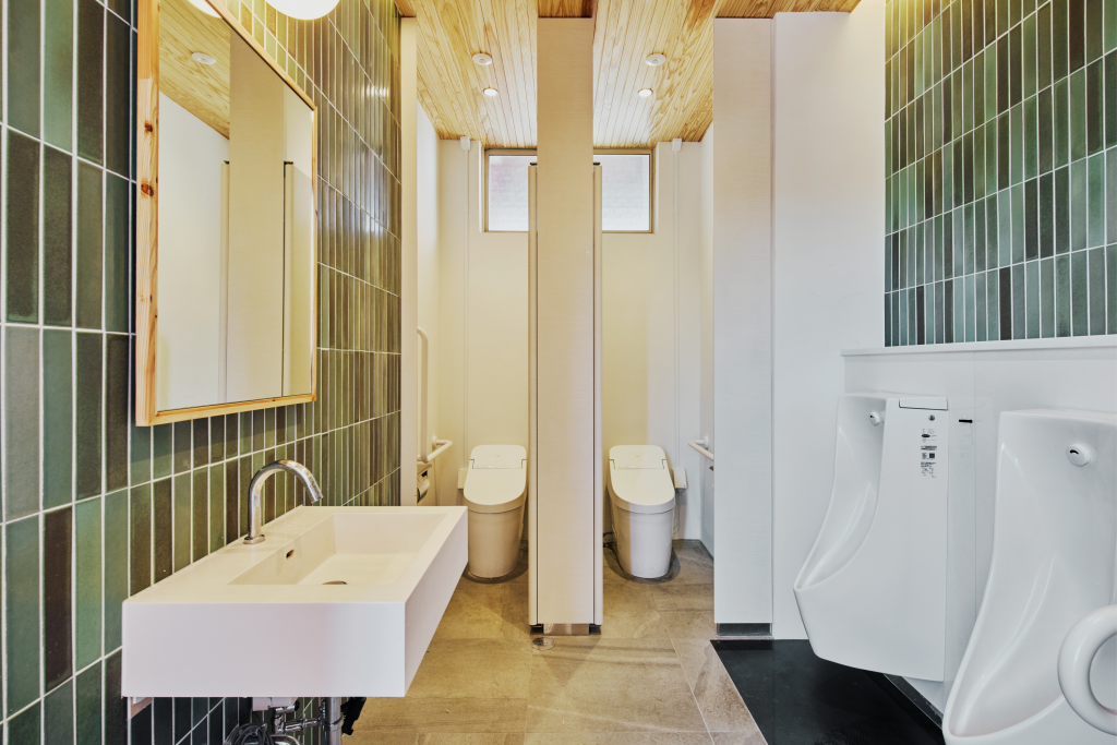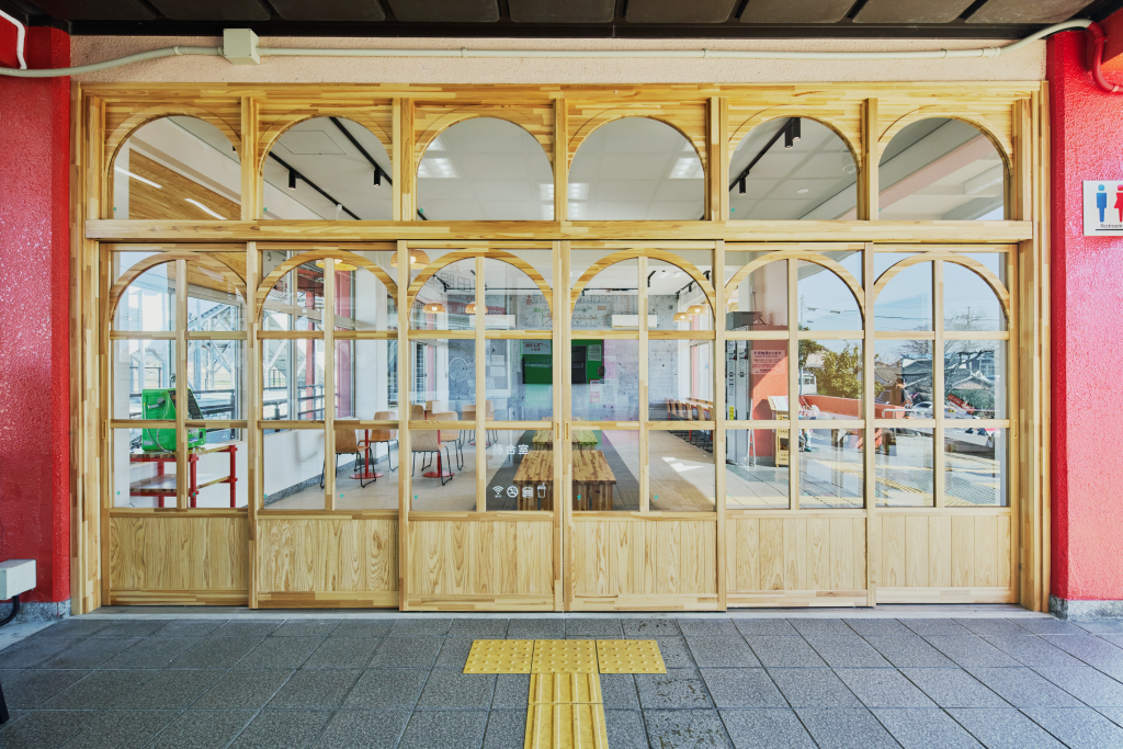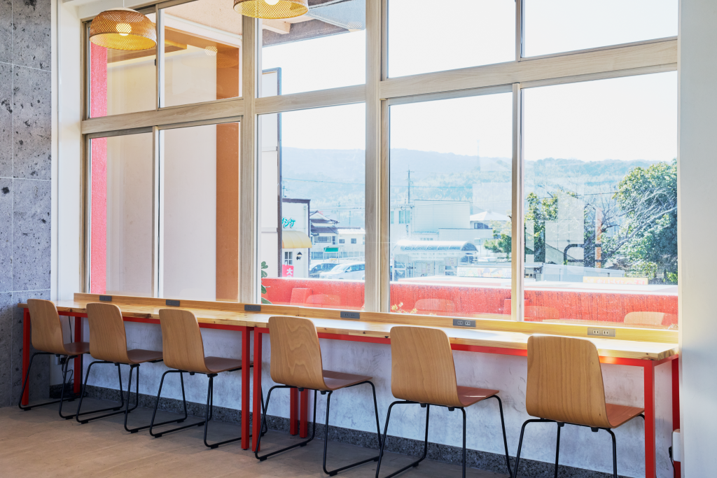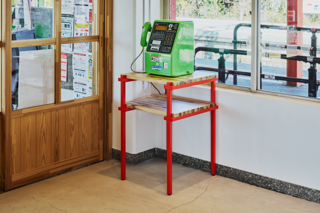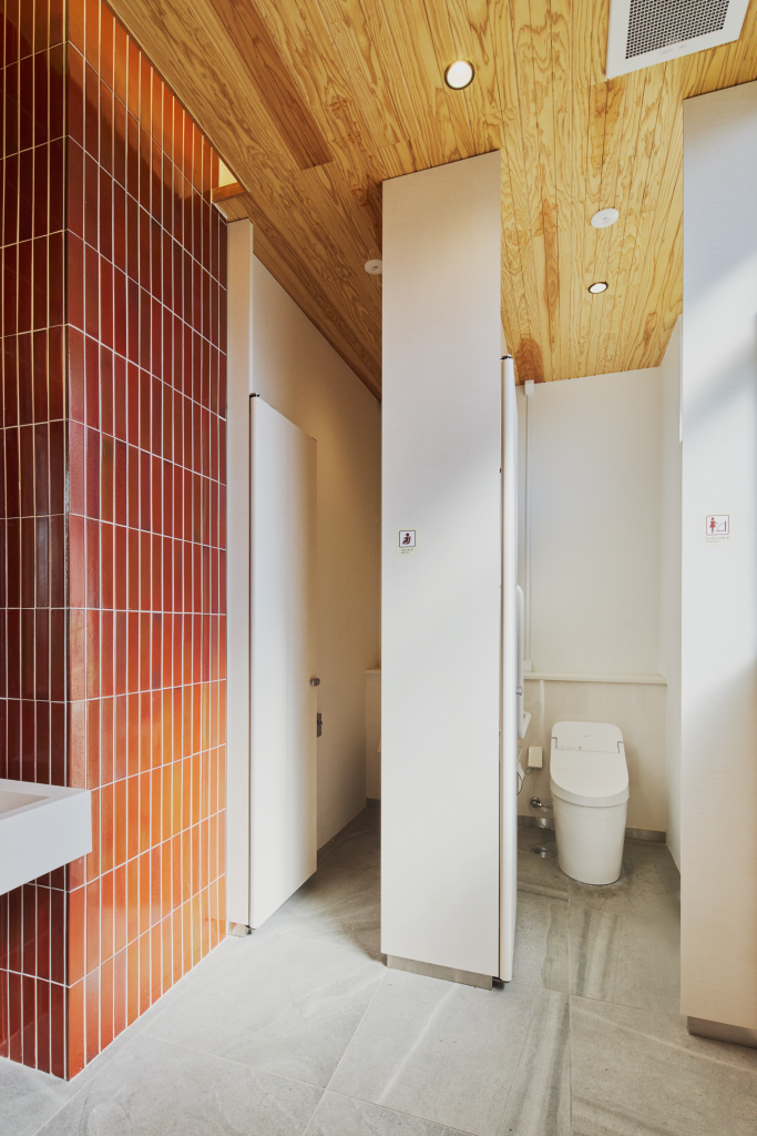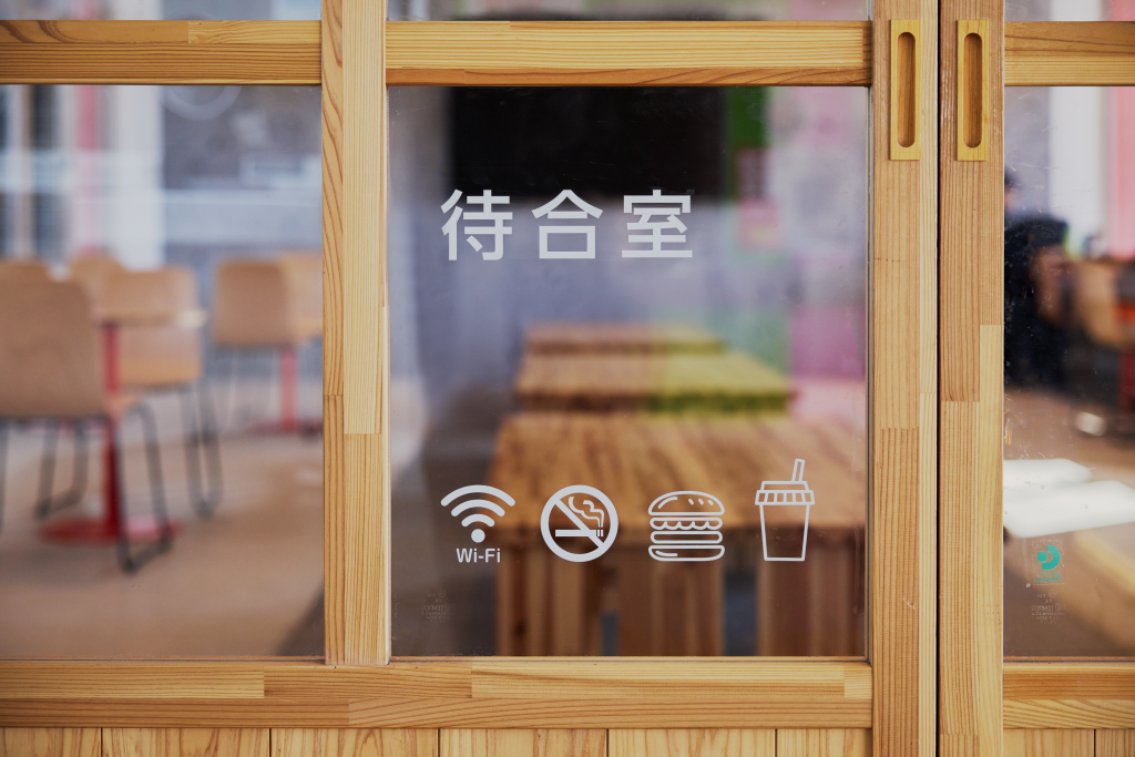 広さ30㎡ほどの待合室入口の引き戸は、宇佐市院内町の石橋から着想し、デザインに落とし込んだものです。さらに、日本三大八幡宮の一つ「宇佐神宮」本殿の鮮やかな朱色を思わせるカラーリングを施した、造作のカウンターテーブル・カフェテーブル・電話台、そして”参道”に見立てた、既存の石タイルを活かした空間中央の床面等、地域のシンボルを丁寧に空間に取り込みました。その他、トイレの改修にあたっても空間デザインを手がけています。
