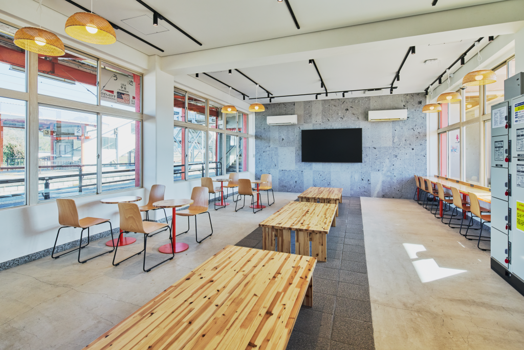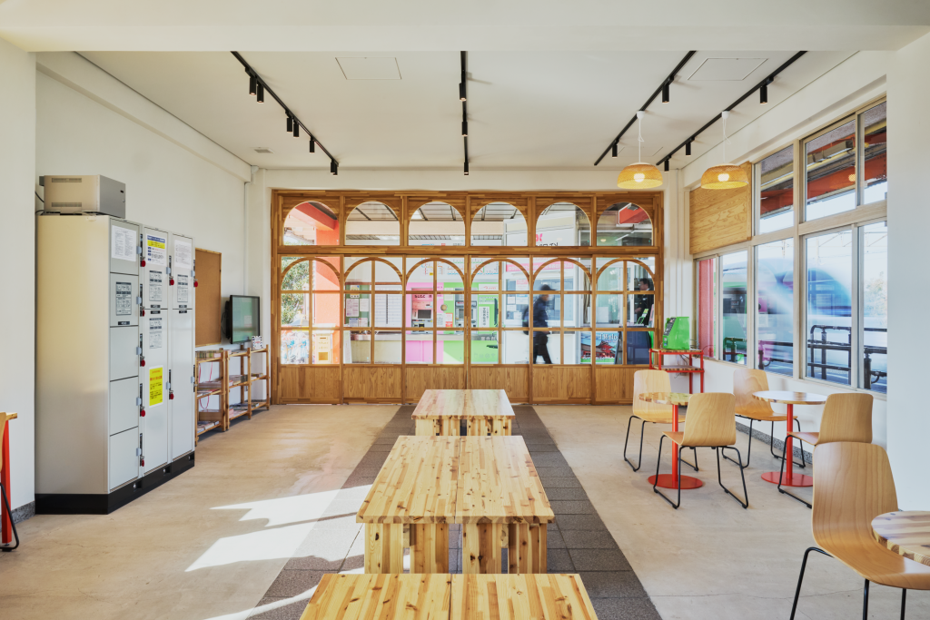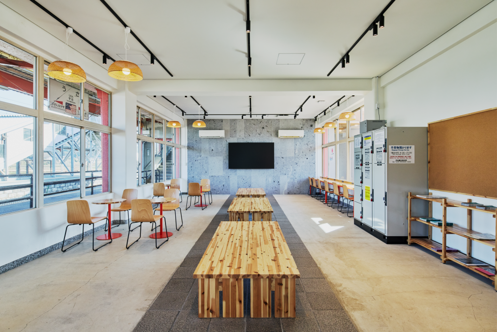 駅のホームと駅舎正面に面する待合室では、学生をはじめとした地域住民と観光客とが同じスペースで、思い思い過ごすことのできる場となりました。