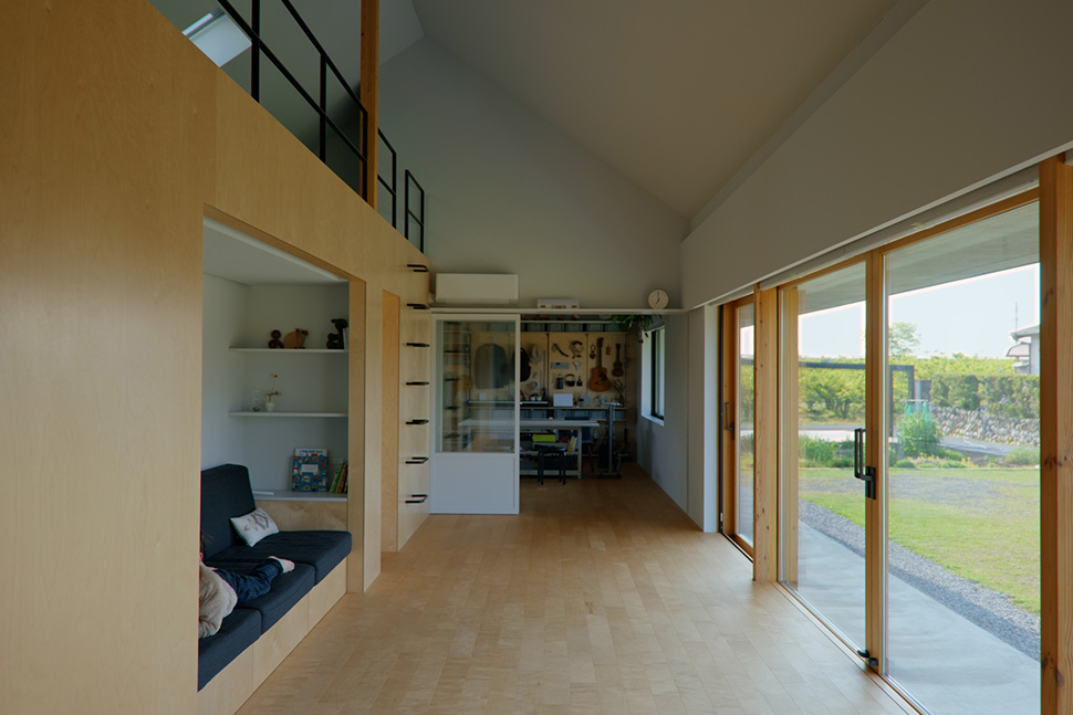 青木さんのお宅はとてもシンプルで、ダイニングと「ブランク」と呼ばれる広いスペース、ワークスペース、そして玄関までもがひとつながりになっており、寝室は左の扉の先、子ども部屋は梯子をのぼったロフト部分に作られています。
