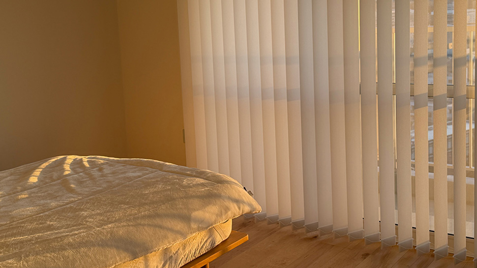 白い壁をキャンバスに、光と影が映し出す景色。バーチカルブラインドの影もいい味わいを添えていますよね。こんなお部屋で目覚める朝、最高に気持ちいいだろうなあ。
