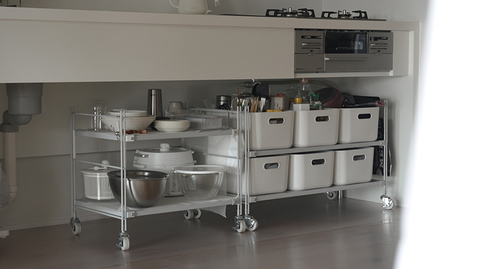 中身が見えない収納は、何が入っているかわからなくなりやすく、匂いや汚れもこもりがち。そこであえてオープン収納にして、必要なものが一目で分かるようにしたそうです。
