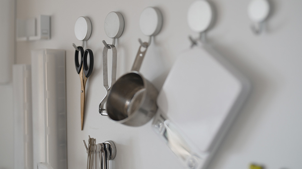 さらにマグネットが付く仕様のキッチンパネルを採用。道具を浮かせて収納することで、水はねや汚れもさっと拭き取れるようになっています。これも壁付けキッチンならではですよね!