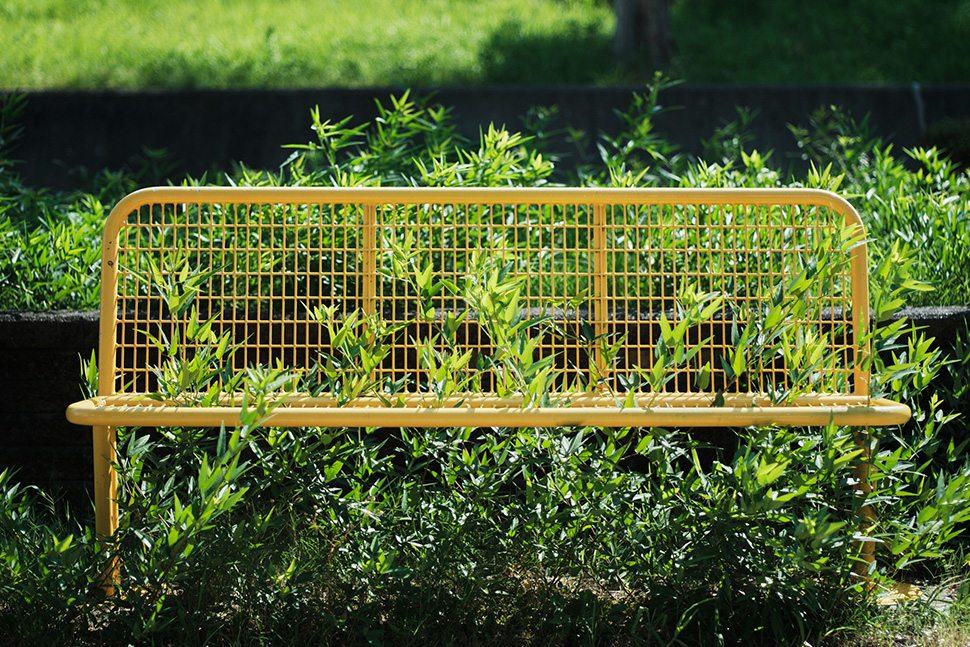 あそこのちょっとした公園に黄色いメッシュのベンチがありますね。座面がメッシュだから下から植物が突き出しているのが面白い笑。リアル「座るのを拒否する椅子(岡本太郎)」ですね。