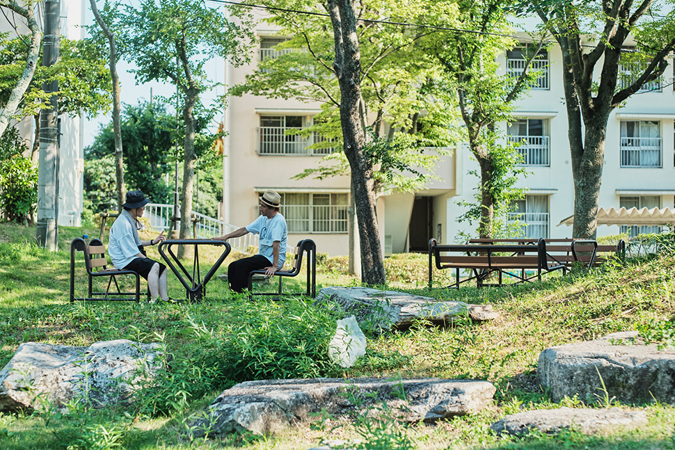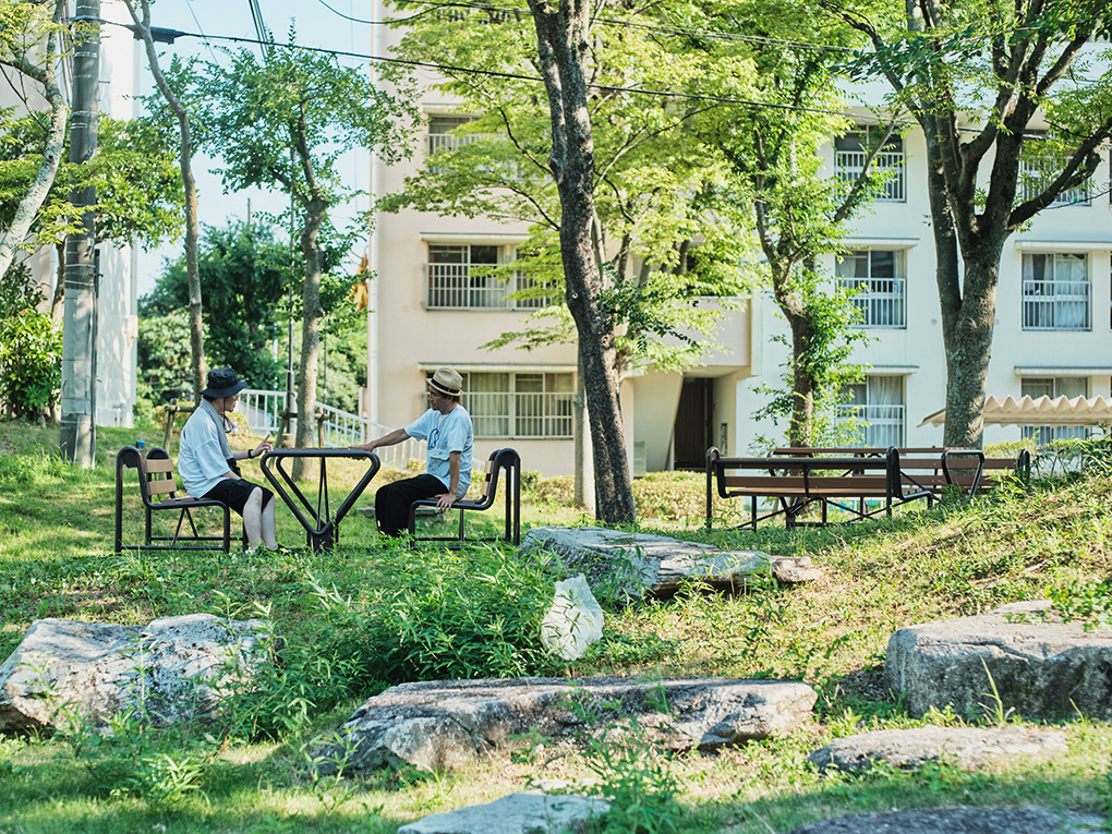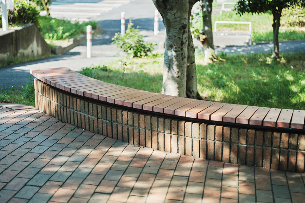 こういうストリートファニチャーがあると、団地の屋外空間と室内が切れ目なくつながっているように感じますね。MUJI×UR共同開発パーツでも「つながるベンチ」というものがあって、外に居ても家の中に居るように過ごせるような家具の設えにしています。