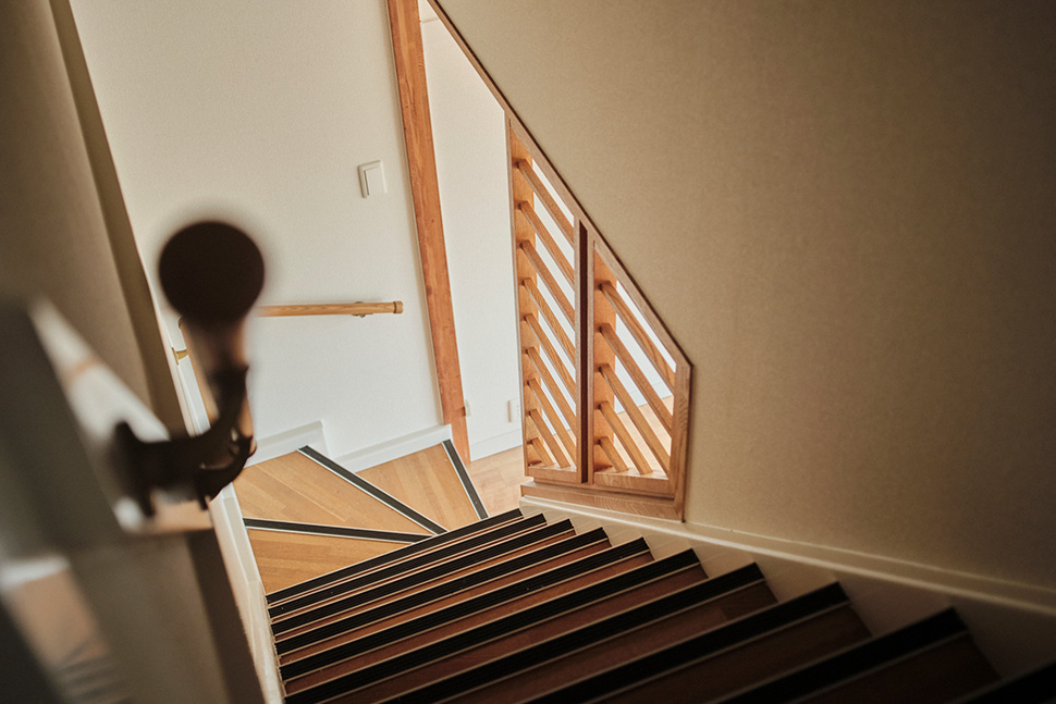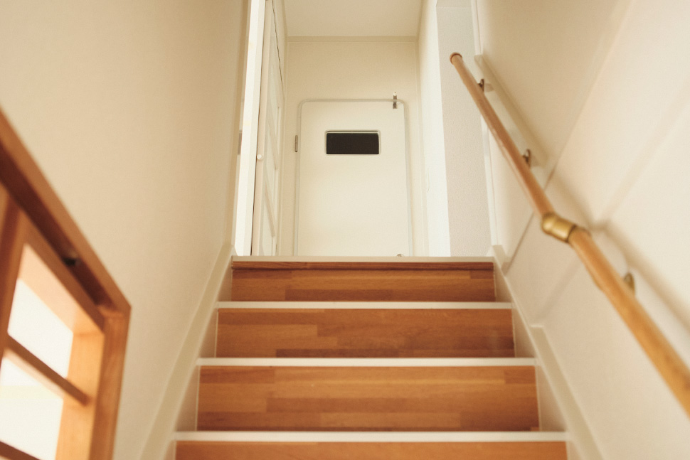 階段を登った突き当たりはトイレかな。建具がかわいい。