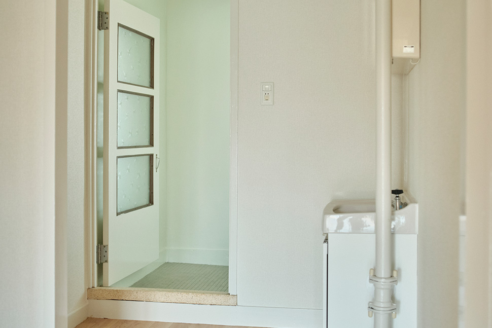 あの角が丸くなった建具はパネル工法の間仕切りでよく見るタイプのものですね。工場で間仕切り壁ごと建具を作っているから、現場での施工も効率的に行えたんじゃないですかね。