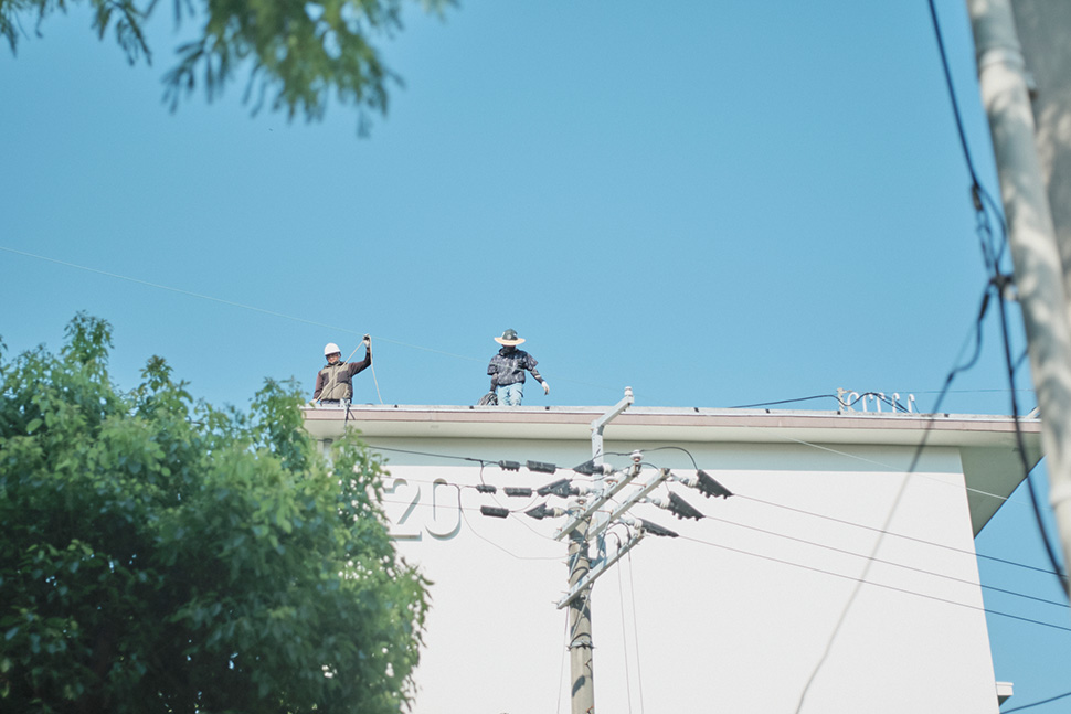 あっ今日は屋上の工事をしているんですかね。屋上に職人さんが。電気工事かも。