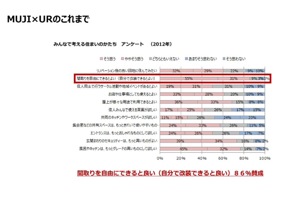 MUJI×UR 団地リノベーションプロジェクトがスタートして13年目となります。MUJI HOUSEとURさんが2012年出会い、プロジェクトのスタートにあたり、アンケートを取りながら、団地との関わりや団地に対してどのようなことを期待しているのかなど調べました。