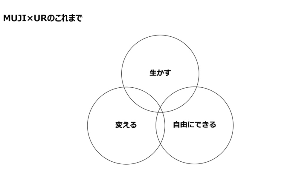 まず、MUJI×UR 団地リノベーションプロジェクトについてのお話をさせていただきたいと思います。「未来を考える団地Lab.」では、団地は様々な魅力が再発見されていて、時代に合わせた変化がまさに生まれているところと捉えています。そんな団地について、これまでの概念にとらわれない新しい形を皆さまと一緒に想像して語り合いたいと思います。