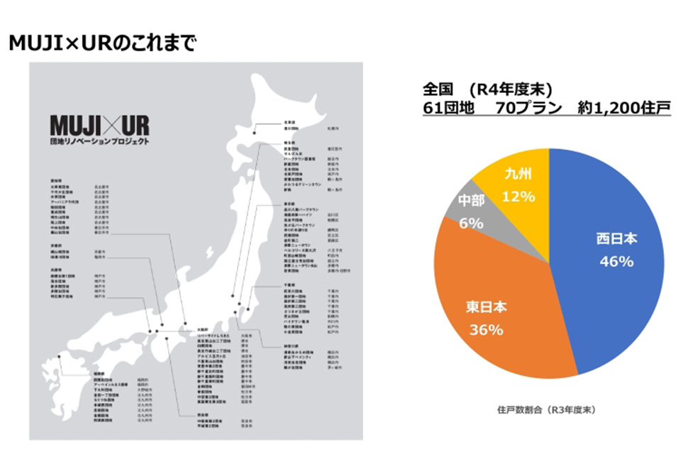 西日本の大阪からスタートしたMUJI×URは現在、北海道から九州まで展開していて、全国で61 団地・70 プラン、全1200戸のリノベーションを行っています。