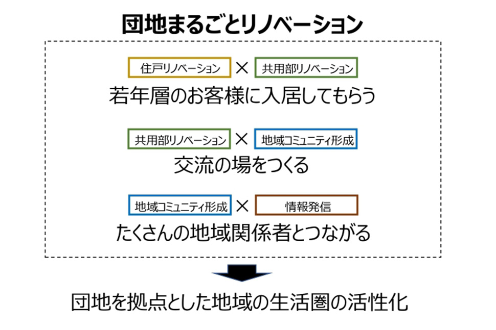 1つ目は、団地住戸と団地内共用部のリノベーションを行うことにより、若年層のお客さまに選んでいただく団地を目指しています。また、共用部のリノベーションを行い、更にコミュニティ形成も行うことで、団地の共有部に交流の場をつくれたらと考えています。