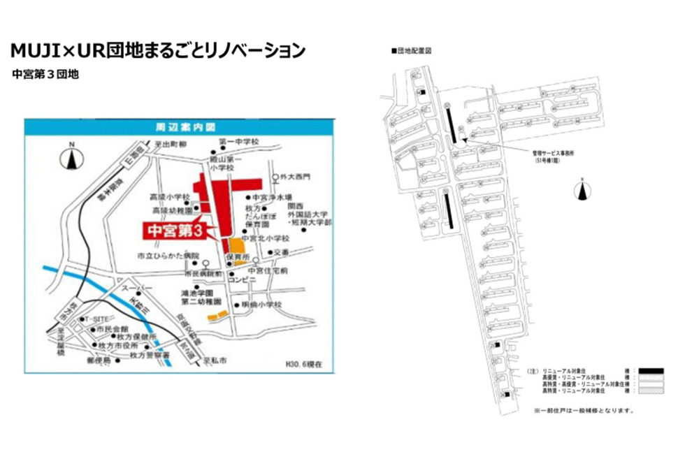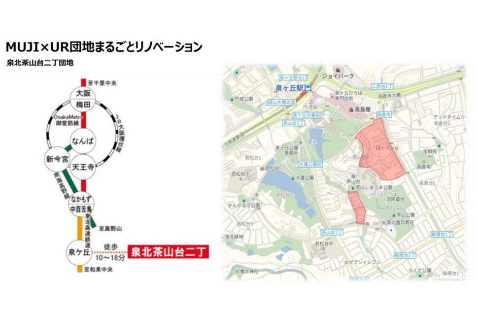 MUJI×UR団地まるごとリノベーションの対象団地は全国で4団地あり、関西は大阪の泉北茶山台二丁団地と中宮第3団地、他は関東の横浜市・港南台かもめ団地と千葉市・花見川団地となっています。