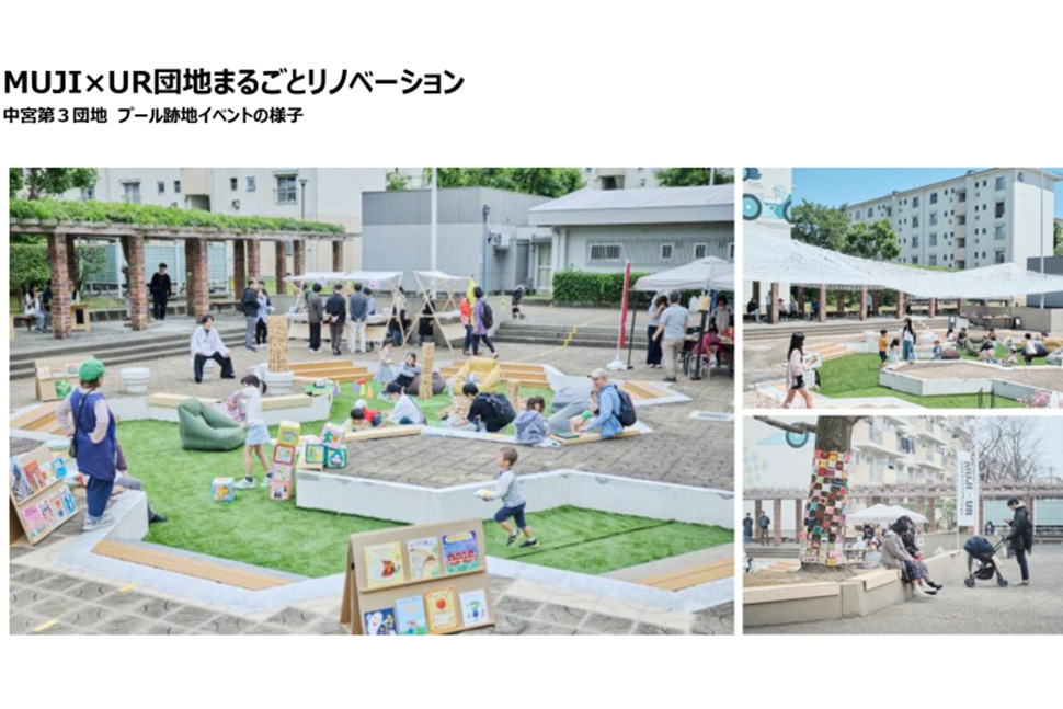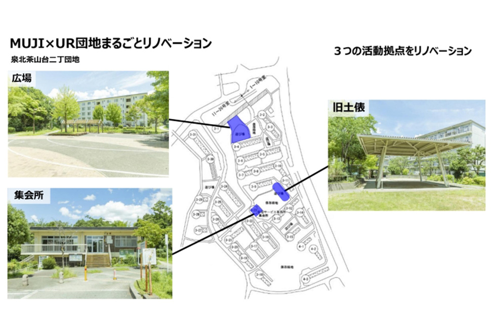 MUJI×UR 団地まるごとリノベーションでは、団地の住居だけではなく、団地外観、屋外広場、商店街といった共用部へもリノベーションの対象を広げ、さらに地域のコミュニティ形成にも取り組んでいます。 団地を拠点として、地域の生活圏を活性化していく取り組みとなっています。