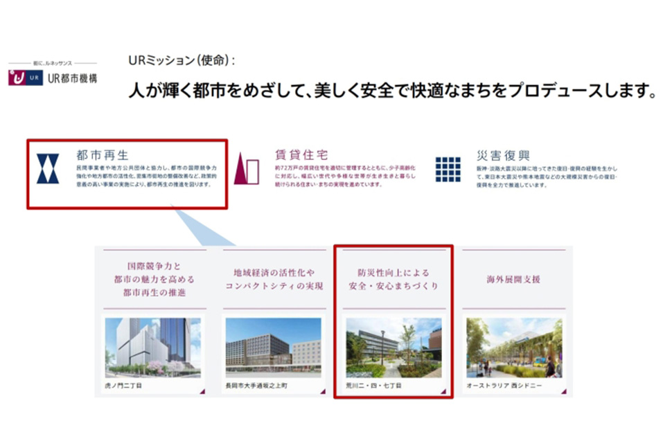 今回、まちのすきまということで、「密集市街地整備」というURが行っている取り組みを紹介させていただきます。私たちURは、「URミッション」という、人が輝く都市を目指して美しく安全で快適なまちのプロデュースを行っています。