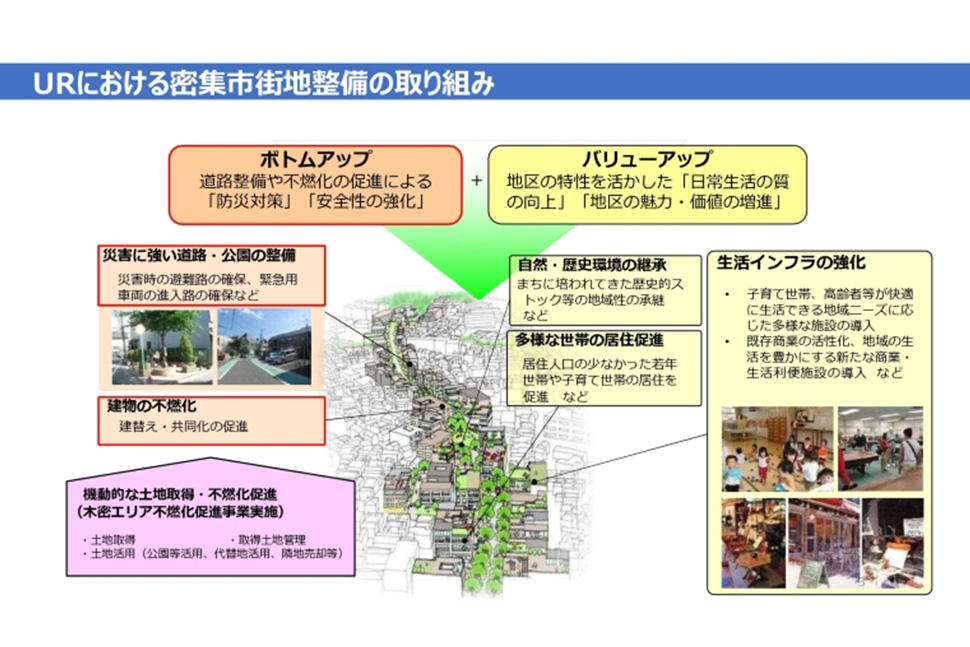 加えて、資料にはバリューアップと書いています。今日はコミュニティ形成に興味がある方が多数いらっしゃいますが、地区の特性を生かした日常生活の質の向上・地区の魅力価値の創造ということで、単純に防災性を上げるだけではなく、地域の価値向上につながるようなまちづくりをあわせて行っています。