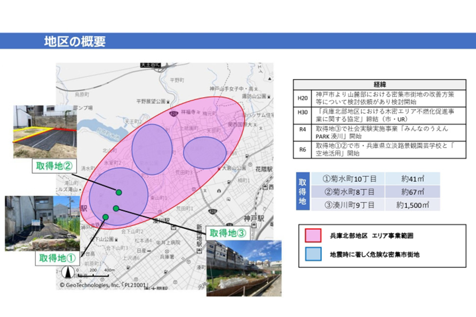 URでまちづくりも行っていることを紹介いただきましたが、都市再生部門に2024年から移り、兵庫北部エリアの密集改善事業の方を担当しています。
