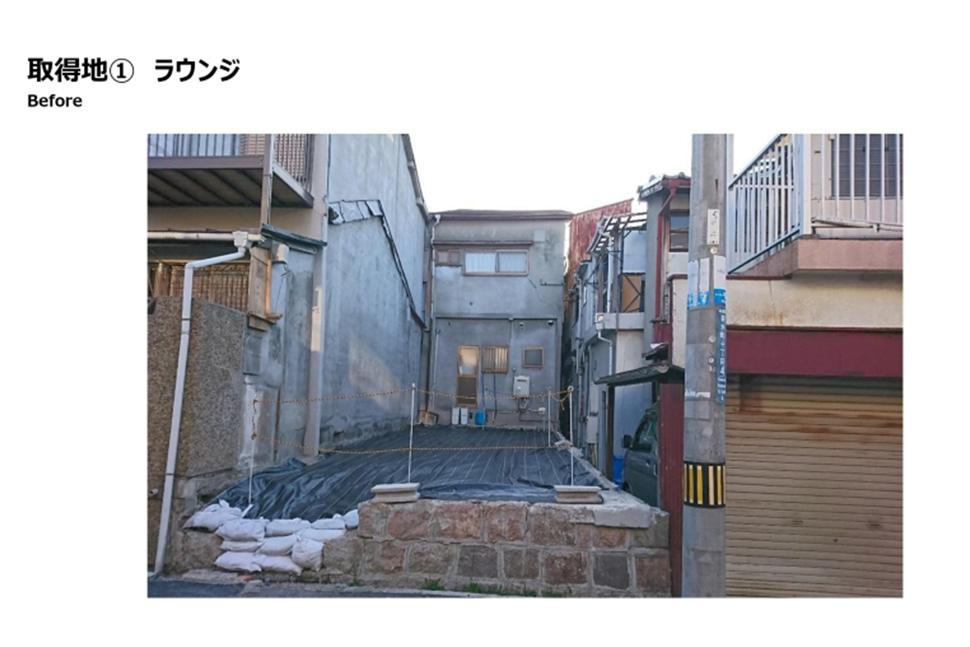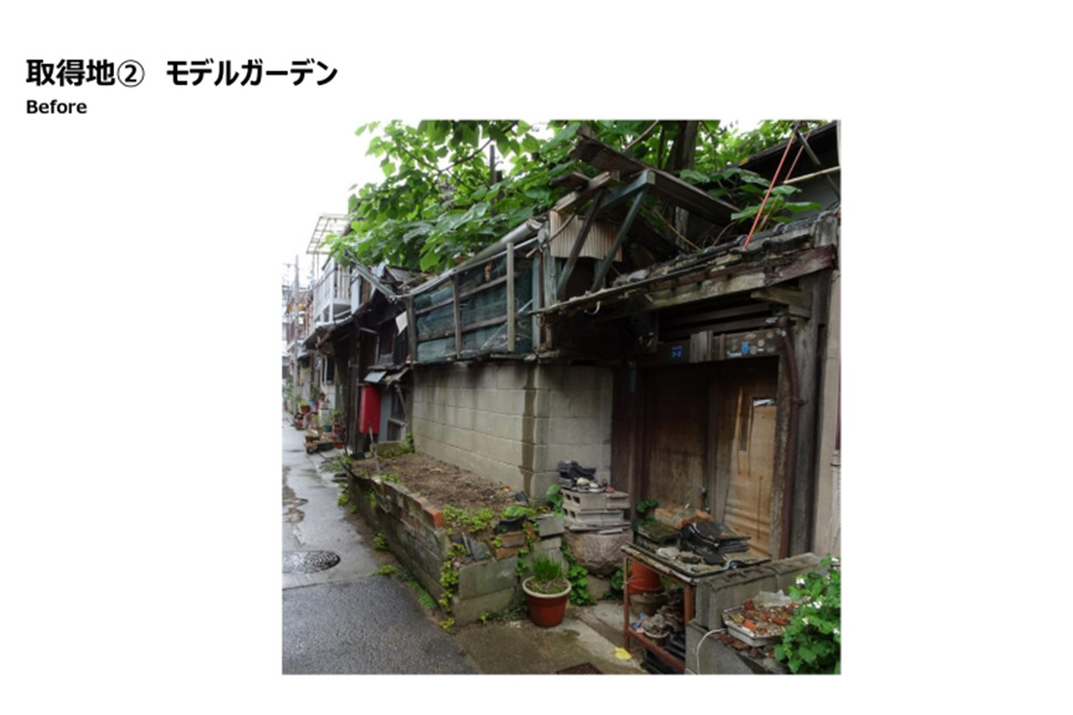 こちらが①の土地で、活用をする前の写真です。今日トークイベントに参加されるにあたり、まちのすきまがどのようなものなのかをイメージされながらお越しになられたかもしれませんが、こういった空き地をURで取得をしています。「すきま感」がすでにあるのかなと思うのですが、住宅が建て詰まっているエリアでこのような小さい区画を取得しています。こちらの写真でいうと、右側が道路の拡幅をするような場所となっています。