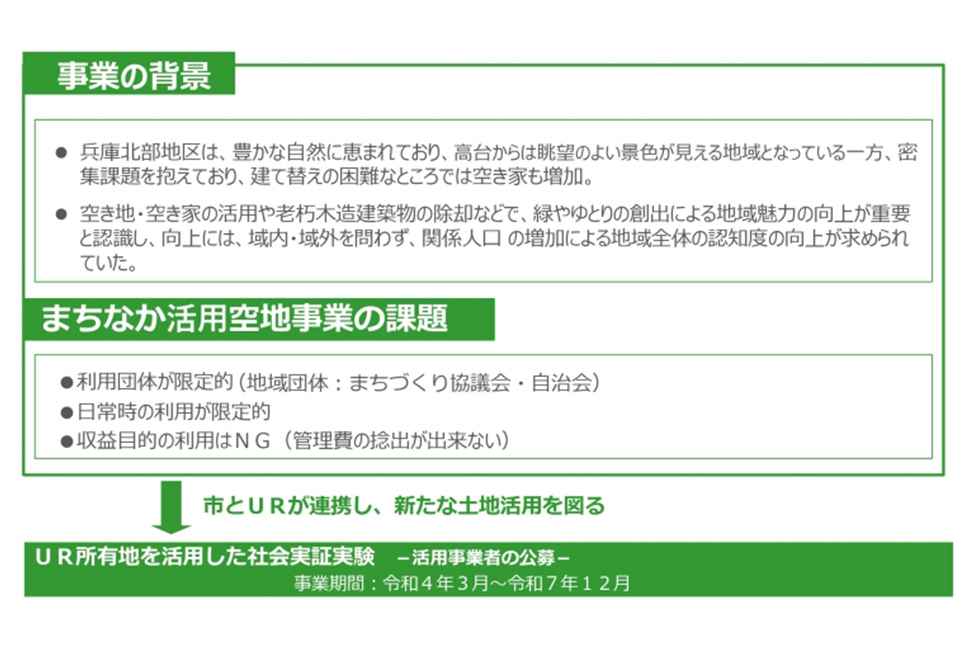 空き地として維持する活動を神戸市さんが行っていて、今までは地域の町内会の方が草刈りなどのメンテナンスをされていたのですが、町内会の方々もご高齢になり管理が大変になってきたということで、空き地を積極的に動かしながら、ちゃんと防災的な機能も維持する方法はないかなということで、「みんなのうえん」を行っています。