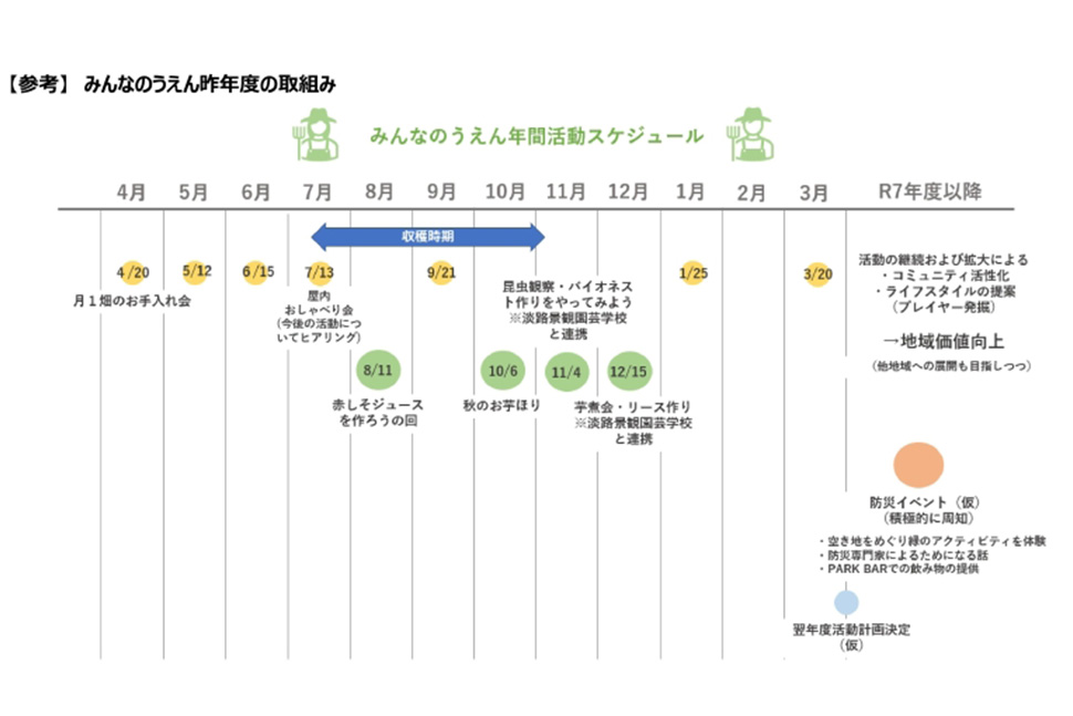 こちらのスケジュールが上の段でやっているコミュニティ活動で行ってきたことです。毎月集まりながら畑のお手入れや草抜きをしたり、ミーティングをして今後の計画を話し合ったりしています。