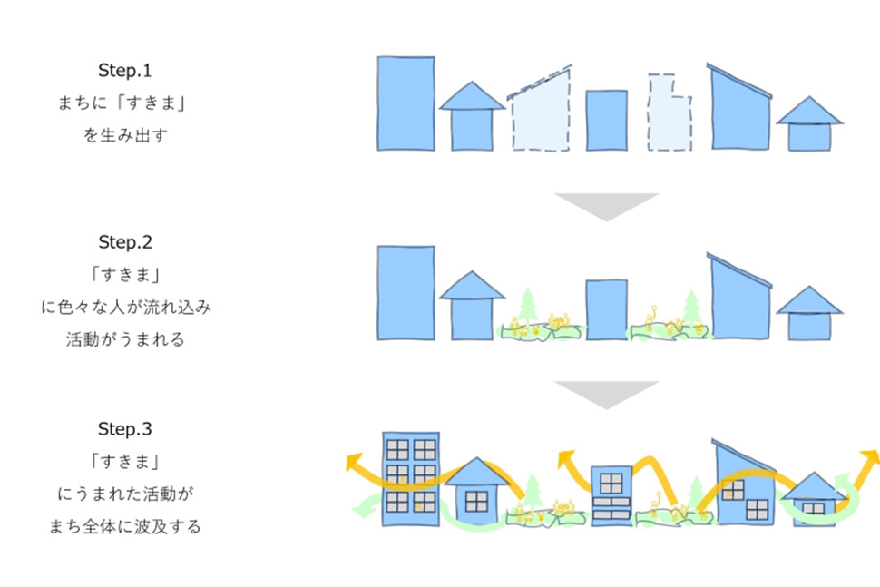まず、最初のステップとしてまちに「すきま」を生み出すと書いているのですが、冒頭でご覧いただいた通り、密集市街地でまちにすきまがないところからスタートしているため、まずはまちに「すきま」をつくり出すことを最初のステップとして考えています。