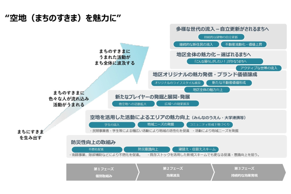 プロジェクトで実際に行っていくこととしては、「すきま」を生み出す防災性の向上のように基本的なことを行いつつ、その「すきま」を活用した活動や取り組みがスタートし、プレイヤーの方に入ってきていただき、さらにその活動がまち全体に波及すると、その地区オリジナルの魅力の発信や地区全体の魅力化、多様な世代の流入のようなことに繋がっていくといいなと考えながらプロジェクトを進めています。