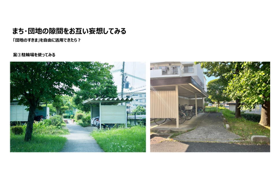 団地を歩いてみると、お住まいの方が日陰でゆっくりするような空間ってあんまりない気がしています。私が以前担当をしていた千里ニュータウンの団地では、工務店さんから寄付していただいたベンチがあり、ちょっとした屋根とあわせて設置していました。そこには連日、団地にお住まいの方が来ていて、井戸端会議みたいなことをされていました。その時、後からつくられた場所に需要があることを目の当たりにして、気軽に集う場所がないのかも知れないと思いました。駐輪場はまさに人が過ごしやすそうな空間になるのがイメージしやすいですね。