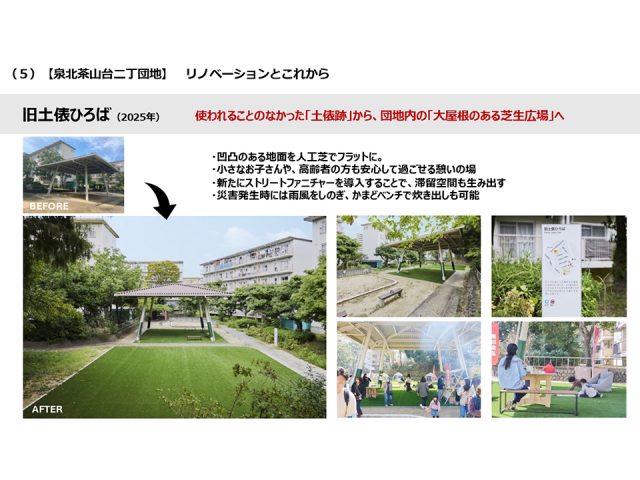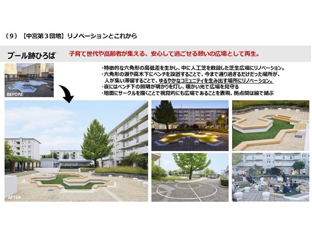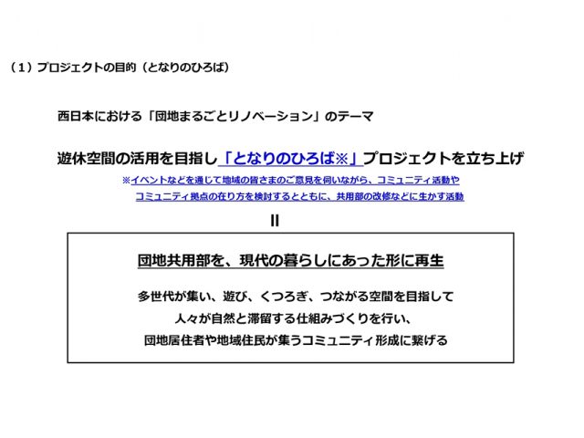 団地まるごとリノベーションは関東でも行っている取り組みとなりますが、西日本では特に広場にスポットを当てていて、サブタイトルで『となりのひろば』としています。