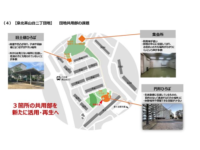 この団地では、共用部の課題が3点ありました。1つ目は資料左上の「旧土俵ひろば」と言われる場所です。大屋根の下に本物の土俵がありました。なぜ団地に土俵があるのかと思われた方も多いと思いますので背景をお伝えしますと、昭和の相撲人気を受けつくられたようです。実際に、ここでこども相撲が行われていた記事が残っています。しかし、時代の変化とともに使われなくなってしまい、土俵部分がデコボコになったことで、お子さんや高齢者の方がつまずきやすく危険な場所になってしまいました。また、土俵のある場所が団地の奥まったところにあり、外から見えにくい場所に位置しているため、今お住まいの方にもあまり知られていない場所でした。