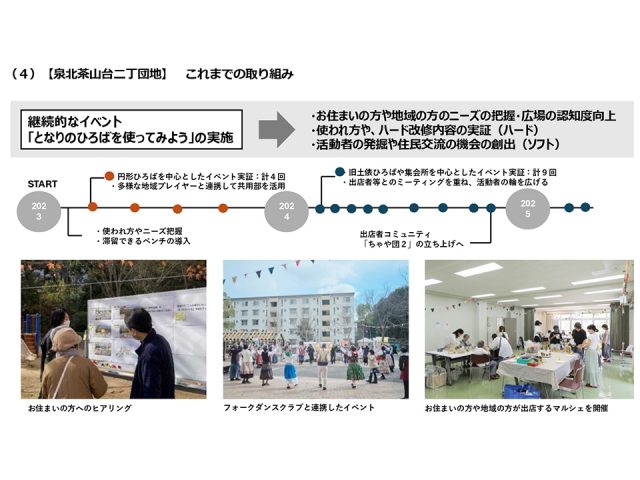 ハード改修の工事だけでなく、ソフト面のコミュニティ形成にも取り組んでいて、団地でのイベントなどを通して、団地周辺地域のみなさんのご意見を伺いながら、共用部の改修に活かしていく活動となっています。