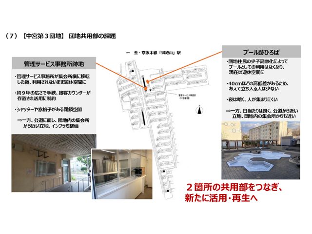「旧管理サービス事務所跡地」は管理窓口として使用していたため電気や水道のインフラが整っていて、「プール跡地」は陽当たりが良く団地内の集会所からも近いため、ここをつなぎ、再び活用できないかと考えました。