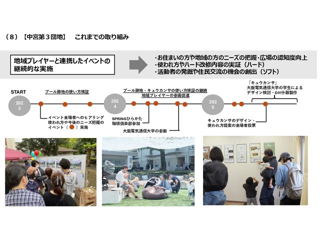 橋本さんからご説明いただきました、課題を抱えている3つの共用部をリノベーションするにあたり、いきなり何かをつくることは違うと考え、イベントを通じて住民の皆さんのニーズ調査を行い、ハードに落とし込んでいくことにしました。