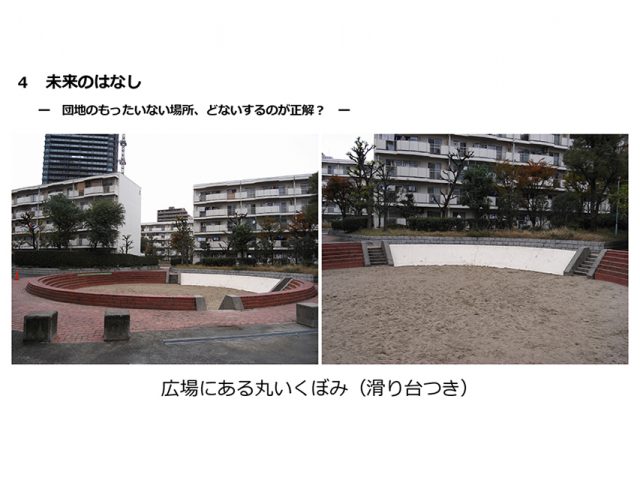なぜそのような反応をしたかというと、ここは幼稚園児や小学生から『まる公』と呼ばれています。こどもたちは「丸いからいい」と思っている感じで、URさんになくすと言われたすべり台もこどもたちは使っていました。実はこの広場にある丸いくぼみのすべり台は、住民にとってはもったいない場所ではありませんでした。URさんも住民の方から言わなかったら分からなかったったことでもあるので、他の人からはもったいないと見えるような場所でも、実は住人に使われている場所ということも実際はあります。ただ、俯瞰して団地を見たときに、もったいないように見えるような場所がたくさんあるというのはURさんの団地の良さでもあります。そういったもったいない場所をいろいろ発掘していくことは大切なのかなと思っています。