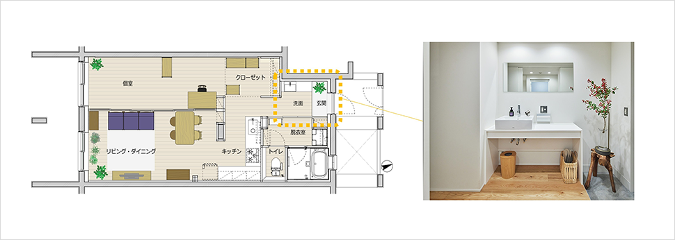 また、顔に付着した花粉が皮膚のかゆみの原因にもなりますから、帰宅したらすぐに手や顔を洗えるようにするというのも有効です。一般的な間取では洗面脱衣室で顔を洗うことになりますが、たとえば図2のように玄関近くに洗面スペースがあれば、より花粉を持ち込ませないことができます。