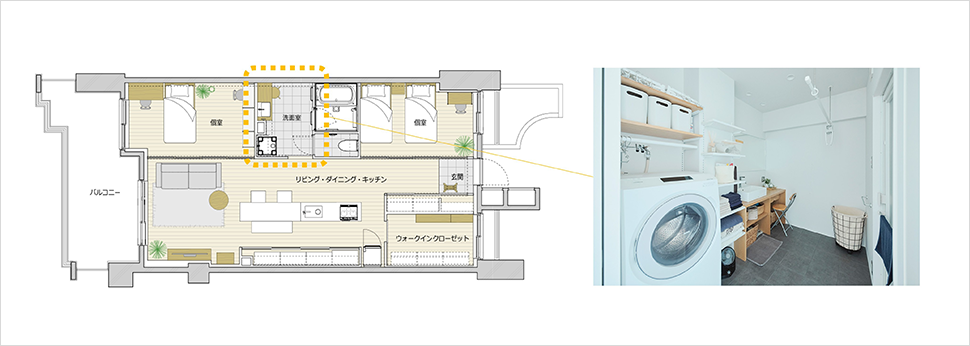 花粉症の時期に外で洗濯物を干すと、取り込む際にたくさんの花粉が室内に侵入してきます。それを防ぐために室内で洗濯物を干している家庭も多いと思いますが、どうしてもリビングがごちゃごちゃするなど、決して快適とはいえない環境になりがちです。リノベーションをする際に、室内物干しスペースについてもしっかり検討することで、室内物干しとすっきりした住空間を両立することができます。図3の間取では、ゆったりとした洗面室を確保することで、ストレスなく室内干しをできる環境を整えています。