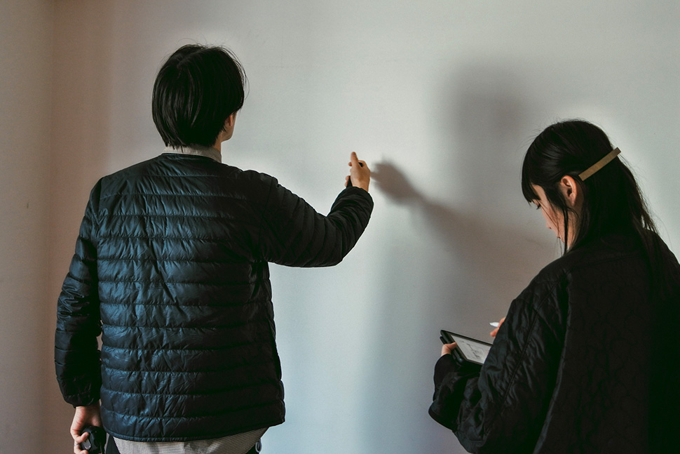 同時進行で、MUJI HOUSEのリノベーションスタッフによる物件の現地調査が行われました。リノベーションプランを作成するにあたって、実際に現地を確認し構造や設備などを確認する必要があるそうです。