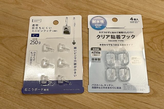 今回は100円ショップで買ってきたフックとピンを使って飾ってみました。