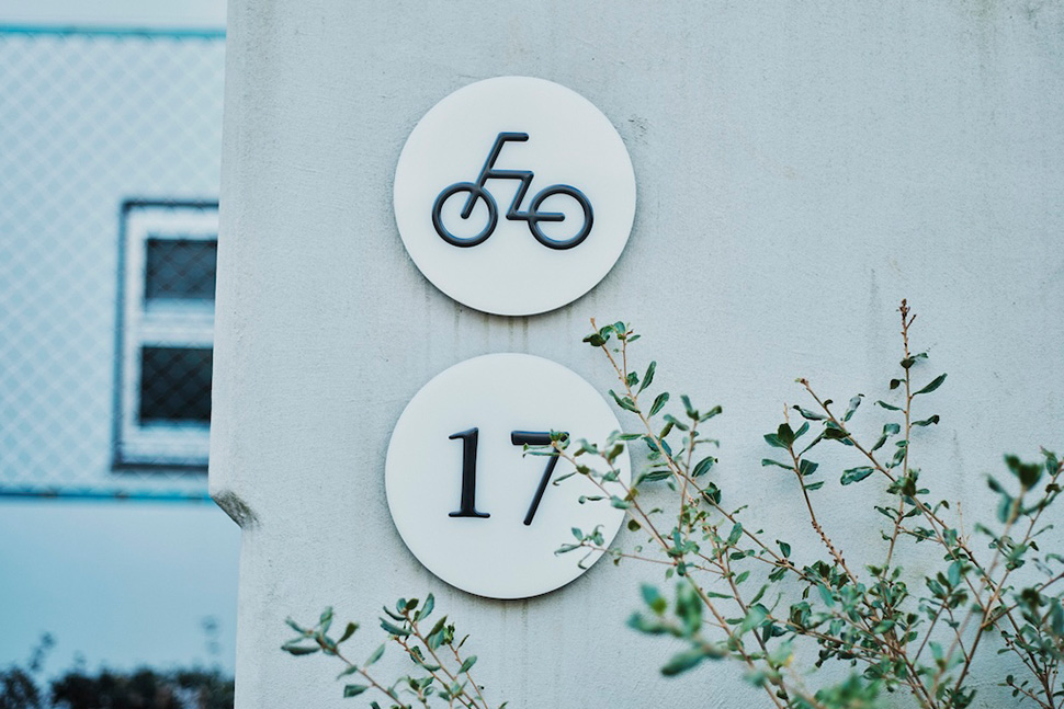 ほんとですね。自転車置き場自体もかっこいいですが、丸いプレートにピクトグラムの立体文字になっていて他の団地ではあまり見たことがないデザインですね。