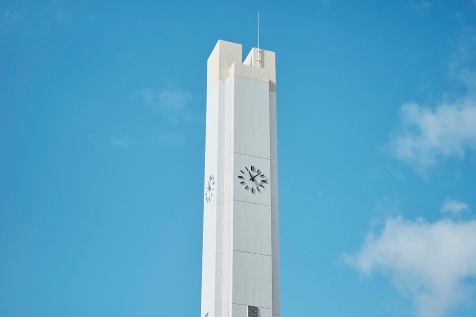 給水塔についている時計は駅からの動線の東側と住棟から見える南側のみに取り付けられているようですね。