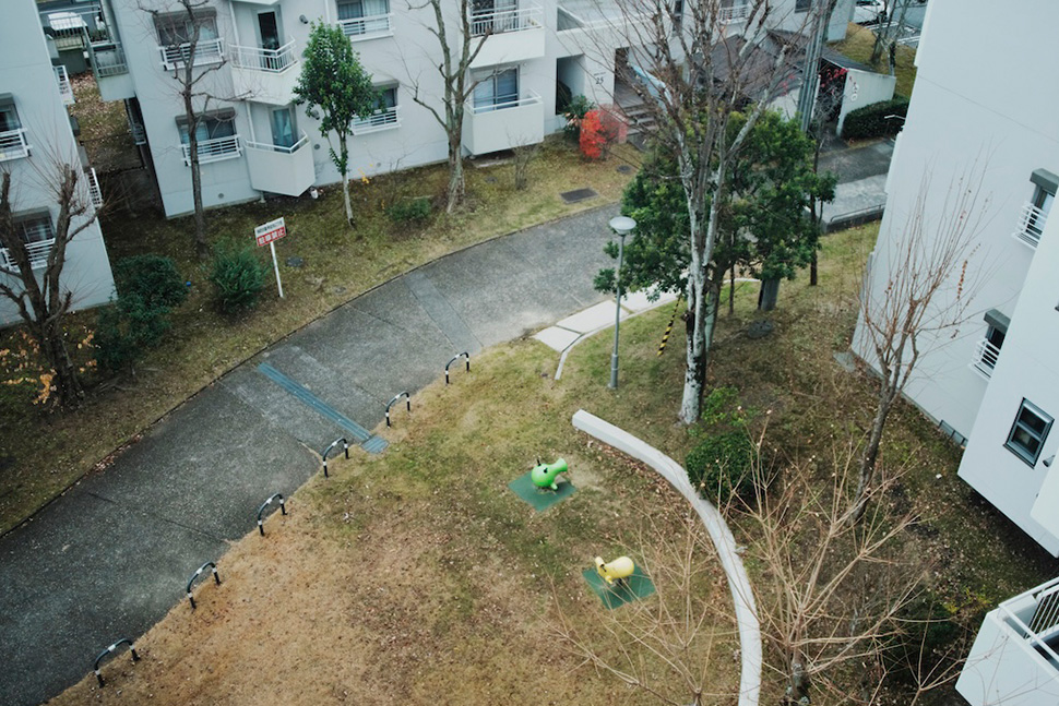 実は僕もさっきからそんな印象で、、 海外っぽいんですよね。団地全体が。一度そう見えるとここから見える遊具や擁壁、曲線の道までそんな風に感じて見えるのが不思議ですね。