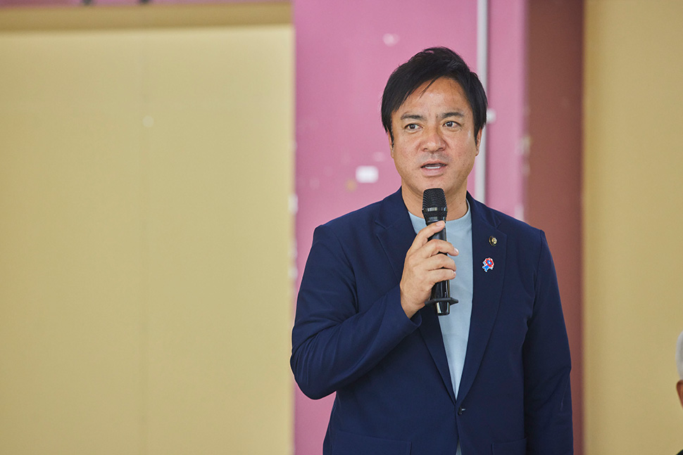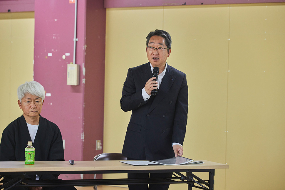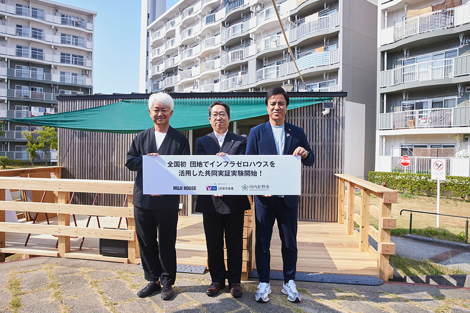発表会には、インフラゼロハウスの設置に向けた手続きや実証実験期間中の運営等において多大な協力をいただいた河内長野市長の西野 修平様、UR都市機構 理事・西日本支社長の高原 功様、MUJI HOUSEからは取締役 商品開発部長の川内 浩司が登壇しました。