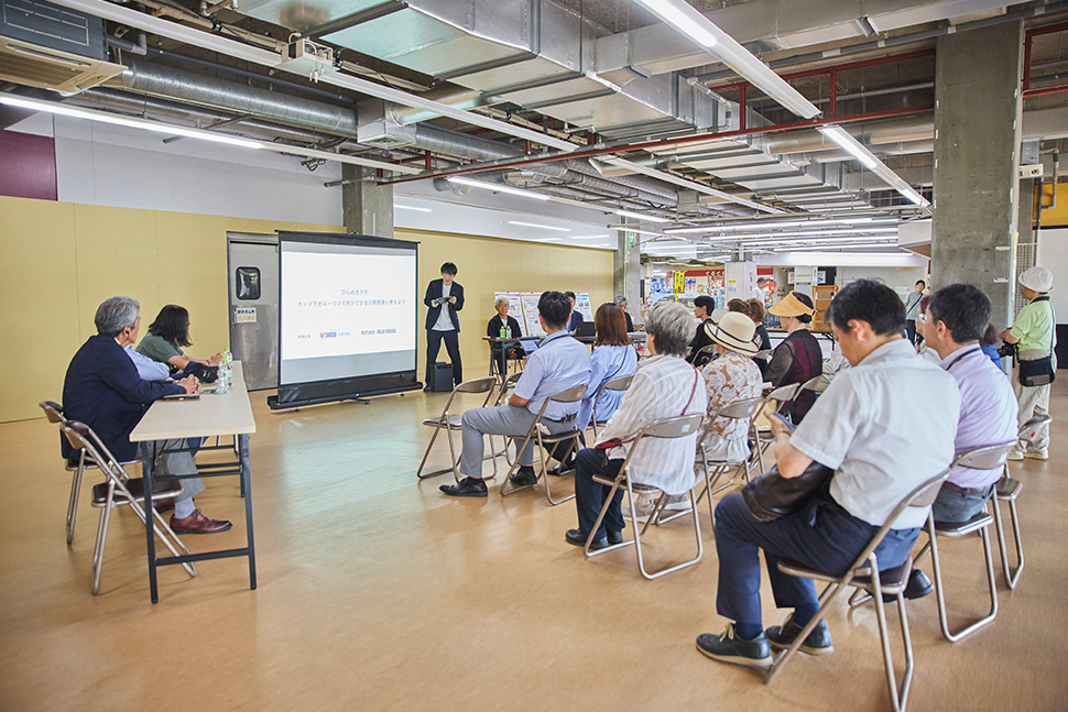 発表会の後には、近隣住民向けのトークイベント「ひらめきラボ インフラゼロハウスで何ができるか開発者と考えよう」を開催。 夕方の時間帯にもかかわらず、20組近い方々にご参加いただき、関心の高さがうかがえました。