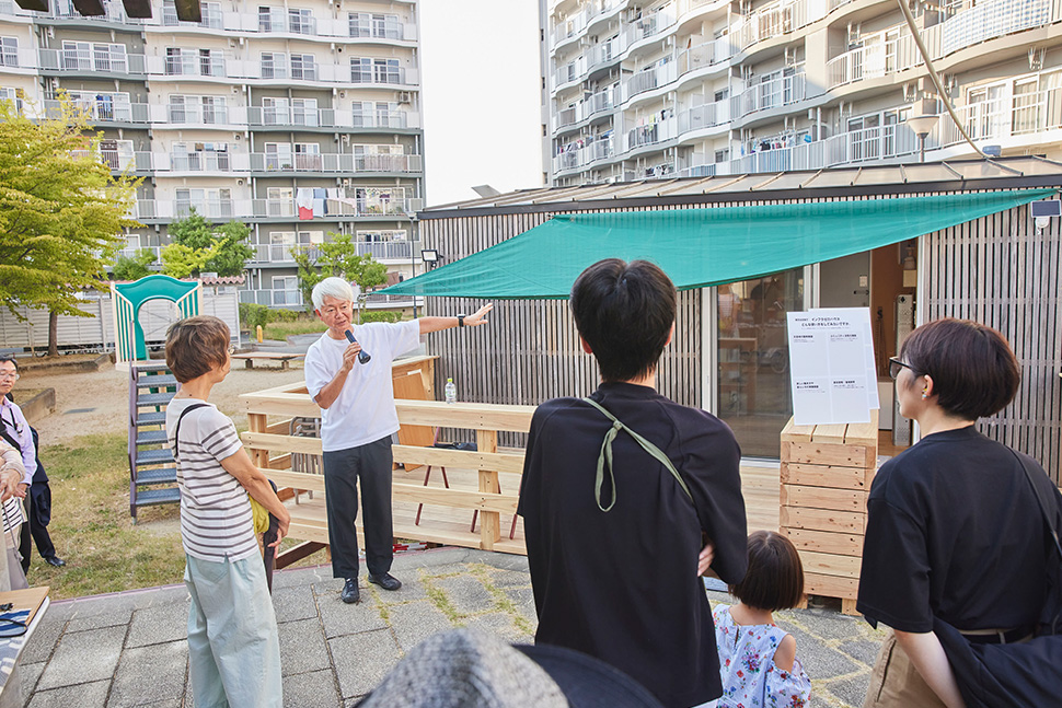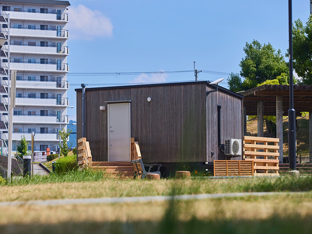 今回の実証実験では、団地における新たな防災・減災のあり方や、地域活性化などに必要な要素を探ること、また、防災意識の向上・環境配慮の推進、くらしのつながり醸成を目的に、南花台団地に「リビング棟」を設置しました。
