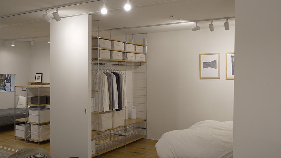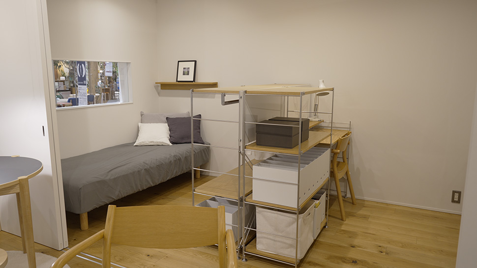 無印良品ではおなじみのユニットシェルフで区切られたお部屋。暮らしに合わせて変えていける設計が自然に実現されていていつも感動します。