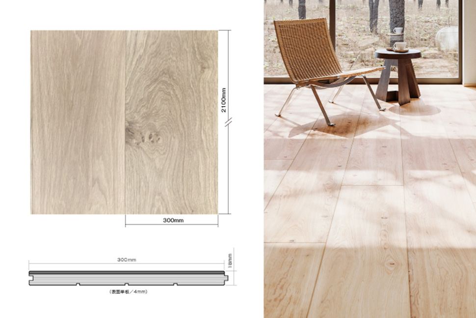 さらに厚みに加え、床材の全体厚み18ミリ、幅300ミリ×長さ2100ミリという規格外のスケールを持っています。通常よりも大判の板材を使用することで、よりダイナミックに質感が感じられます。