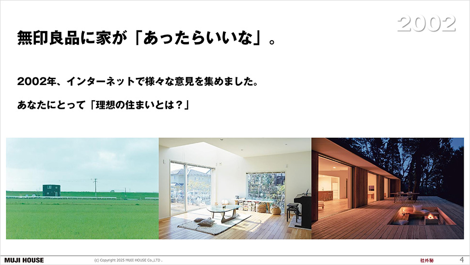 無印良品の家は、2002年に「無印良品に家があったらいいな」という声から始まりました。