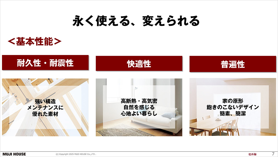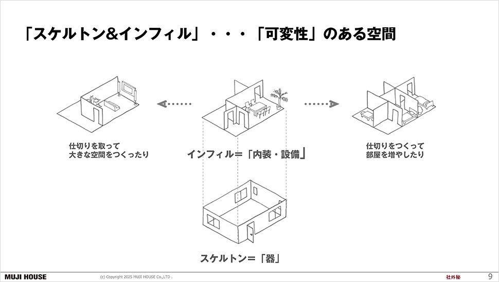 器としての構造はしっかりつくり、内側の仕切りや設備は、暮らしの変化に合わせて変えていけるようにする。