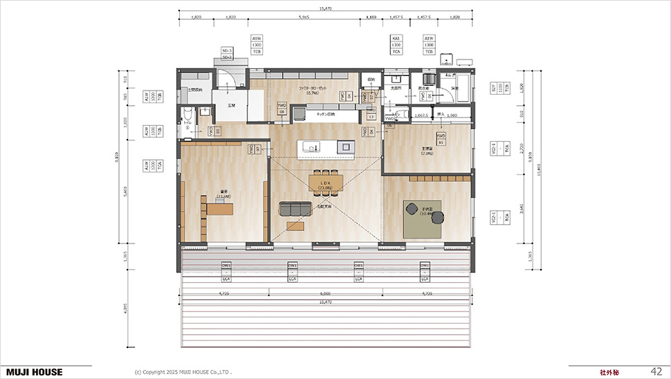 陽の家の大きな特長は、勾配天井でつながる大きな一室空間と、ウッドデッキによる屋外とのつながりです。