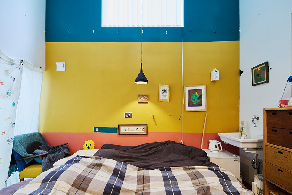 Sさんの家でひときわ目を引くのが、ご自身でペイントされたという緑・黄色・オレンジの3色で塗られた寝室のカラーウォールです。
